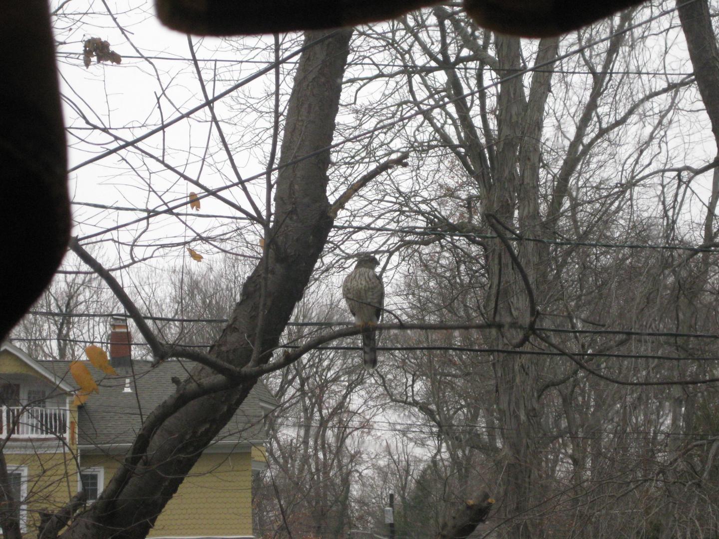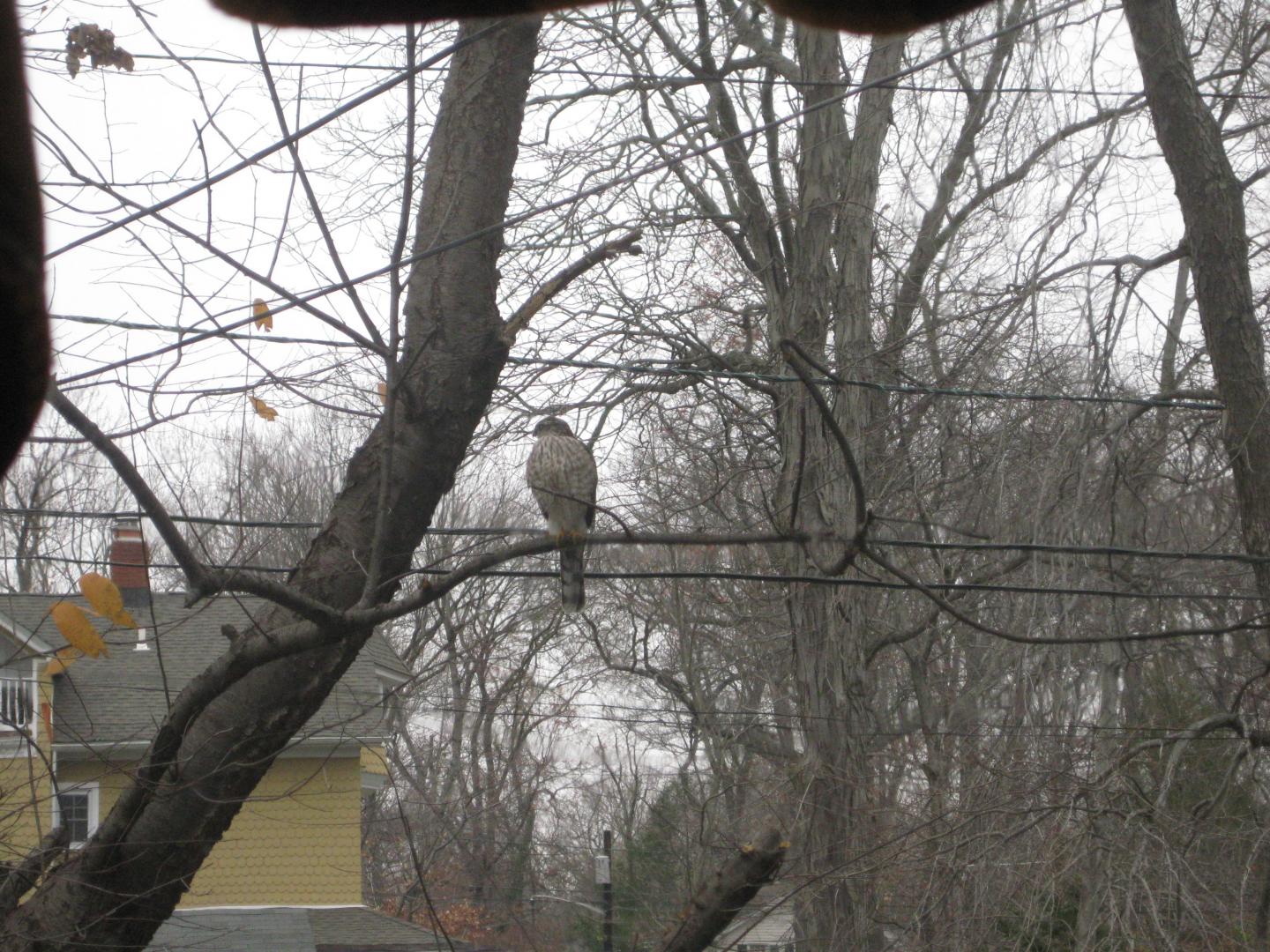 I think it's a juvenile female Cooper because of her size and coloring. Could be a Sharp-Shinned but hard to tell without a telephoto. Legs were very bright yellow.
