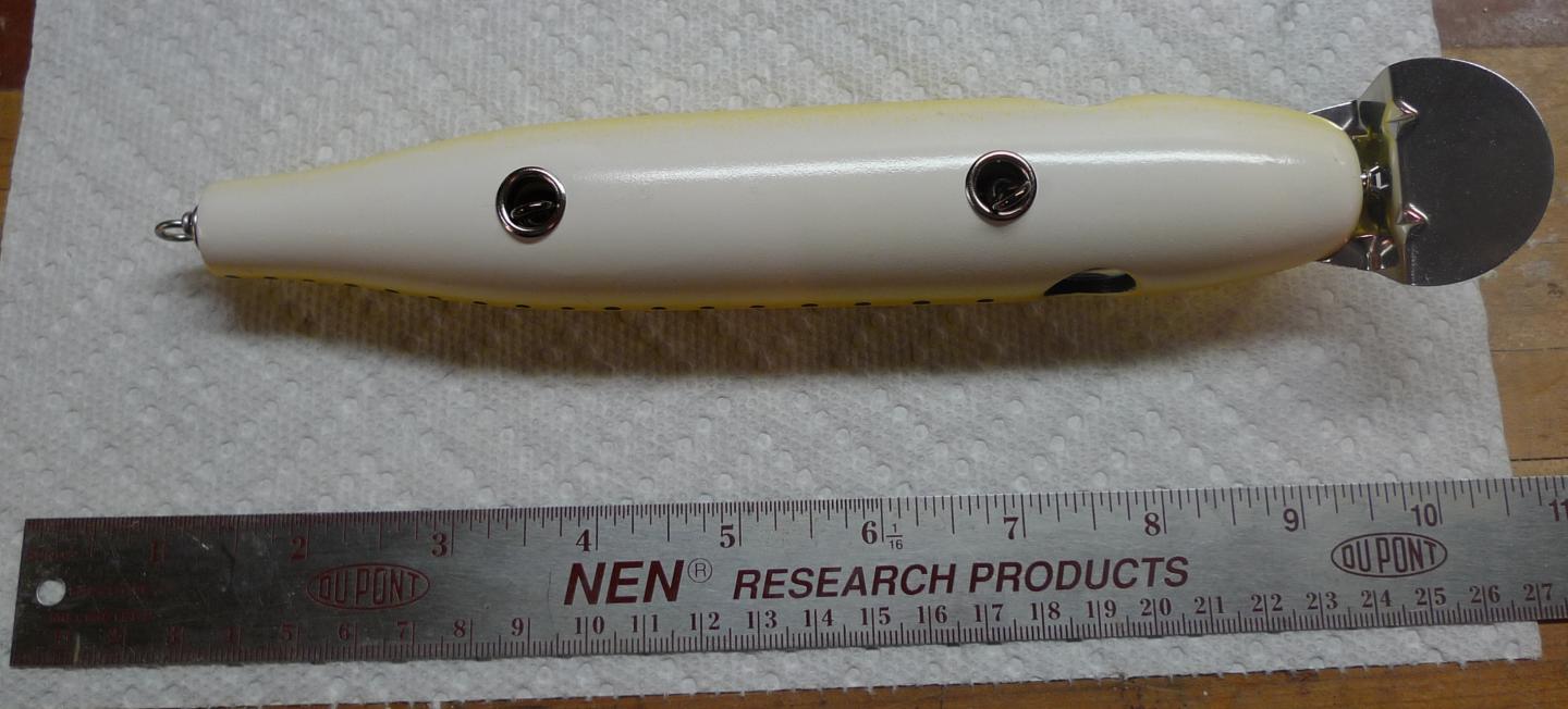 Adding a cherry slopehead with a white belly and sweet grain above. Big fattie is over 2" thick and has 2 belly wts just behind the front hook hole. #3 Pikie lip.