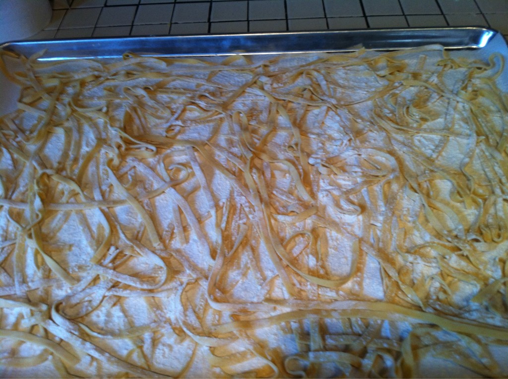 My kids got me a pasta maker for Christmas and it was probably my best gift ever.The first couple months I used it all the time but with the warmer weather we switched gears to the grill. With this cold spell I figured I would break it out for Sunday dinner.I rolled out some sheets of pasta and had the kids hand cut some wide noodles to go along with chicken and broccoli and homemade alfredo sauce.The addition of some red bell peppers made this dish even better. A nice chianti made for a perfect afternoon.Homemade pasta doesn't resemble store bought and is easy once you get the hang of it. Bon apetit.