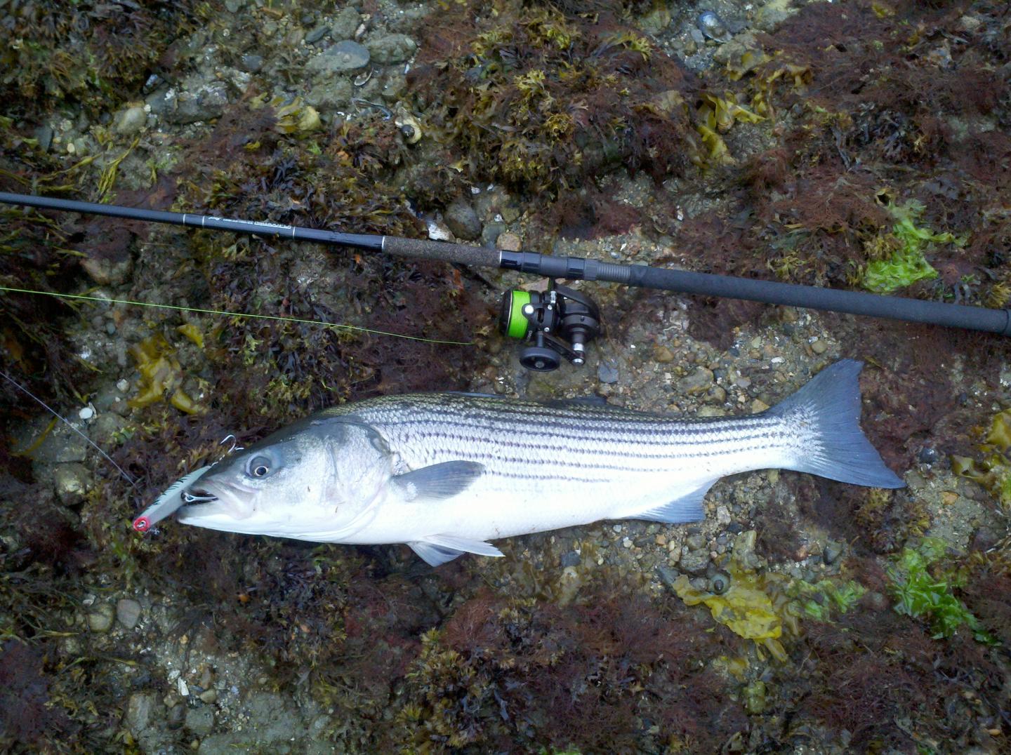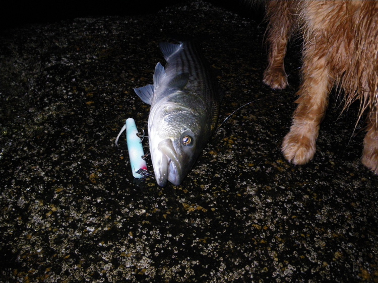 Here's a conrad fish, nothing special (maybe #15), but illustrative that you need to cover the water column top to bottom when you fish. Tough night, very calm and little sweep, nothing showing. Worked the jetty spot thoroughly with dannys (surface), darters (midwater) first without a touch. I was pretty sure it was empty, but felt compelled to try dredging the bottom. Drove a conrad down, worked along real slow, made about 10 cranks and pow. Telling that this fish must have watched the other plugs pass over it 30 times without interest, but when I put a conrad in front of its face...... bingo.