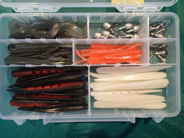 Since I've had no luck in getting the Ledge Runner Bait business sold, I'm curious is this might be the way for me to go, so I'll put out the first box. At 2011 MSBA show pricing which was already discounted, this lot would sell for $65 like to get $45. It includes 6 each of the Kalin Ultimate jig heads which I use for most of my fishing in 3/8oz, 1/2oz and 3/4oz weights. I have 10 counts each of 5" smoke grubs, 4" split tails in olive with green glitter and what I'd call a squid. Then I'd round it out in 6" half jerks my personal favorite in red/black and pearl. Throwing in a 10 count of Spro #6/80lb swivels and 5 count of 5/0 owner jig hooks with screw locks for a weightless presentation.