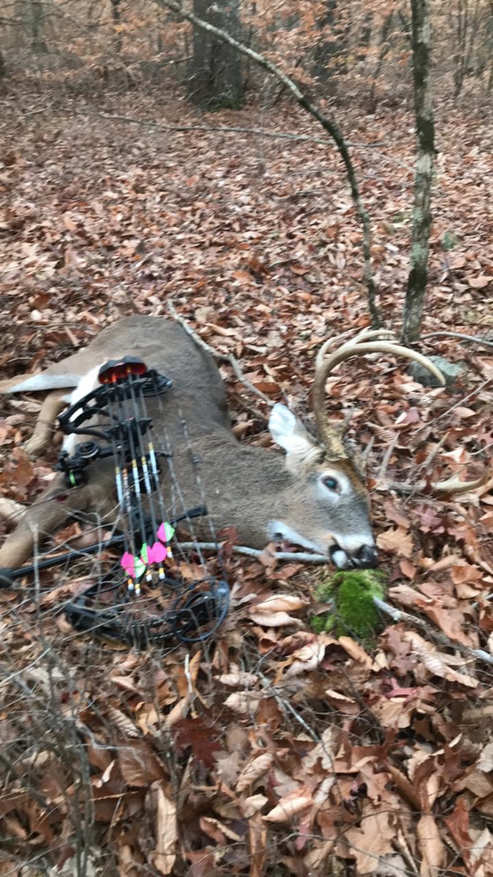 2nd sit of the year and I shot a small 8 point. Had tons of pictures on my trail cams but by the end of the second week of bow all of the deer disappeared. Didn’t really start seeing them again till mid November. Thats when it happened. I had a beautiful 8point come to my stand. Once he hit the scent trail I laid he went ape #^&#^&#^&#^& trying to figure out where the doe went. I use a single pin sight and was set for my shooting lane where I had the drag hanging at 25 yards. The buck was so confused he started to head back to where he came from. He was stopped quartering away and I guessed it at 30 so I held high on him. I let it fly and the arrow sailed clean under him. I lated ranged the opening at 36.5. He left, bounding twice then walked away. Being disappointed I figure I would change stands after lunch and head to a stand on the edge of a swamp where I had seen 3 does the night before. After lunch while wee were getting ready to head in, my buddy asked if I was going back to the stand from the am, he said maybe that deer will come back since he wasn’t spooked. I agreed with his assessment so I headed back in to the Ridge stand as we call it. We were in stands by 12:30, around 3:15 I could hear something making it’s way in front of me. Around 3:45 I could see a big bodied deer about 80 yards in front of me, and he was heading right too me nose to the ground. I quickly saw his amazing rack and drew my bow as he approached and started to turn down hill. He came to a screeching halt when he got wind of my scent drag 15 yards in front of him. He was behind a small pine tree, but I could see him well. I needed him to walk 5 more yards to be in the shooting lane, for what seemed like 10 minutes, but was only like 2-3 I was holding at full draw while he looked around for the doe. I am nursing a bad hip, and it was killing me at this point. My arms were getting tired too. I decided in that moment it was either let it down, accidentally release, of thread the needle. So I threaded the needle and the arrow glanced off of a pine bough and thwack. The buck flipped over, but that sound I had heard before. My buddy had arrowed a monster, the buck flipped over and was down. The deer jumped up 30 seconds later and bolted. We never found that deer, the sound I surely heard was shoulder bone. Not wasting another second I nocked another arrow and settled on his vitals. The arrow flew true. After recovering the deer and upon field dressing him I determined that I hit him just in front of his leg, he was quartering a little to me and looking back, and took out both lungs before hitting the opposite shoulder. The first arrow had done the job. The second arrow also found its mark of the heart. This is my biggest buck to date and we have him all summer on trail cams. We thought he was a big 8 or 9, turns out we were wrong he was a 10