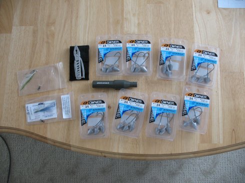 2 Bill & Juls teaser rigs, mini stainless mult-tool unused, hook-honer takes single AA works fine, 8 Owner Saltwater Bullet 3 pack jigs in 3/4 oz....you pay shipping and $60.