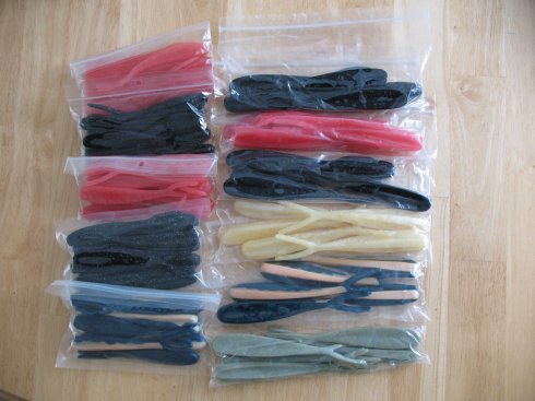 Ok, we are getting to some stuff you might never see again, bigger baits and in a proven design. Pains me to part with it, since I can't pour, but I need to pay for the trolling motor install on the new boat. There are 6 bags of the 7-1/2" split tails and 5 of the 5-1/2" split tails, in pinks, blacks, herring, pearl and olive. These would have sold at $53, but I'll let them go for $40 and you pay shipping.