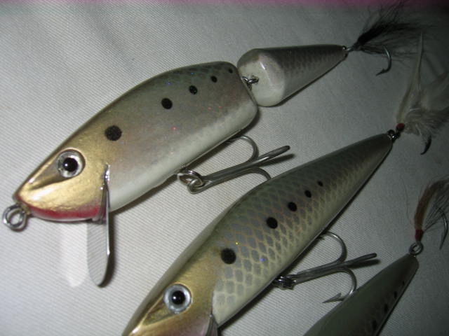 the little white sparkle one, doesnt show in the picture, but its solid blue shimmer for imitating small baits...the yo-zuris are there for scale as is the habs [rip] mullet....all hand carves. The big bunker is rock maple , the little one is walnut, the others mix of walnut, maple, basswood.