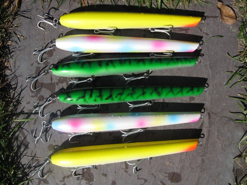 Re-think that. Pencils are very effective lures when worked slowly and allowed to slap and glide, with an occassional pause, then some fast thrashing, a pause, twitch, and restart a slow gliding retrieve. In the canal you can't appreciate this very well, particularly as the current gets moving. Your pencils look to be modeled on the Gibbs, which are excellent lures. I'm sure they will fish well, I'm only curious because I've never fished one of the big three hook Gibbs ones and this year I have a friend who has taken/lost some appreciable fish using a long (9") skinny spook so I'm thinking about bigger plugs for this winter. I like your stuff very much.