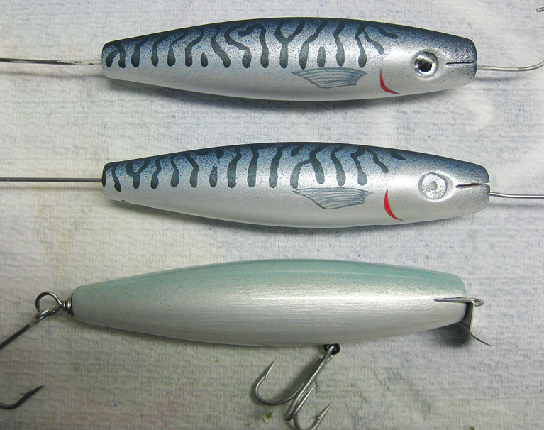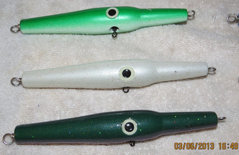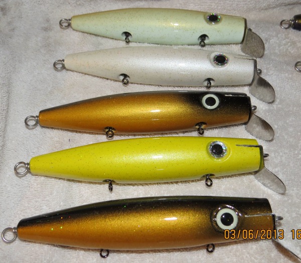 3 of my new swimmers. They are 5.5" and swim just subsurface to around 4 feet depending on retrieve speed. 2 macks still need epoxy.