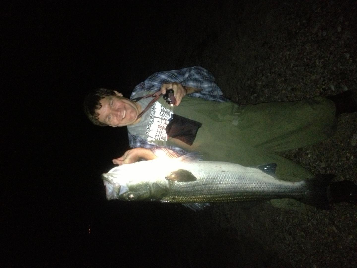 Couple nights later the first pic is a mid 30 lb fish caught on a really cool plug. It is an over a foot long needle made by a gentleman from Conn. that I got in a trade. Gigantic is the only way to explain it. Was really fun using that plug and the fact it floats allowed me to fish it real slow with a lot of pauses like few nights before. Fight was great but the fish put the siwash thru my finger landing it, lucky I crush the barbs. The next fish was the best of the few nights. I wandered away from the few guys I was fishing with that night and again the med white danny just twitched on the surface and reeled extremely slow was the ticket again. The fight was one of the best I have had in years with tons of drag being taken on several great runs but being only sand in front of me there was no anxiety of losing the fish on rocks or structure. Very enjoyable. All the above fish were revived and swam away. I do sell fish but it was quite rewarding letting these fish go.