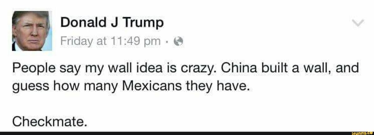 or “Jeb Bush just talked about my border proposal to build a ‘fence,’” he tweeted. “It’s not a fence, Jeb, it’s a WALL, and there’s a BIG difference!” or President and Mrs. Obama built/has a ten foot Wall around their D.C. mansion/compound. I agree, totally necessary for their safety and security. The U.S. needs the same thing, slightly larger version!