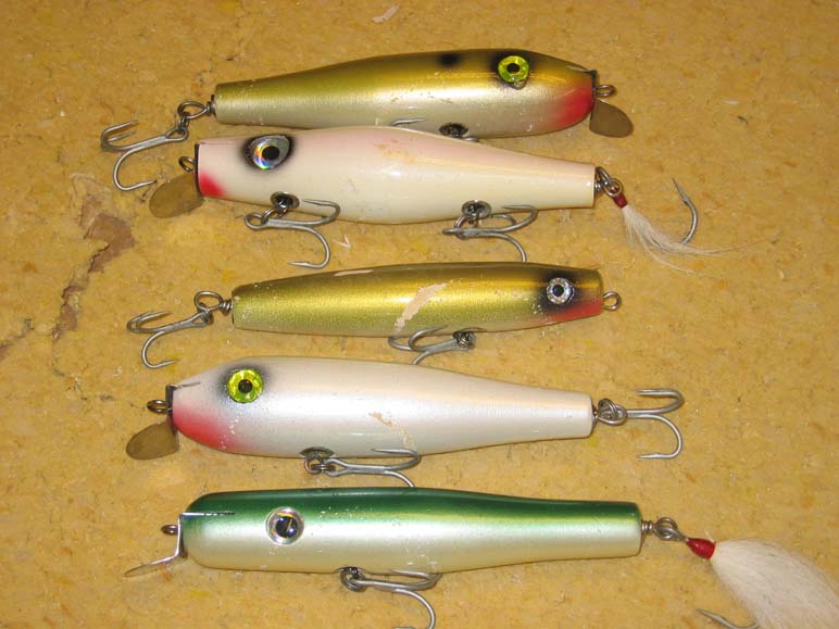 on the right is from top, a pikie I made a bunch of, a RM Smith danny that the bass wouldn't leave alone, then a spook modeled after a jigman spookk in that olivy color, a pearl white pikie I made, then a junior from Mike Thomas at M&D's