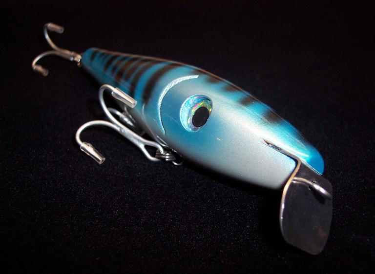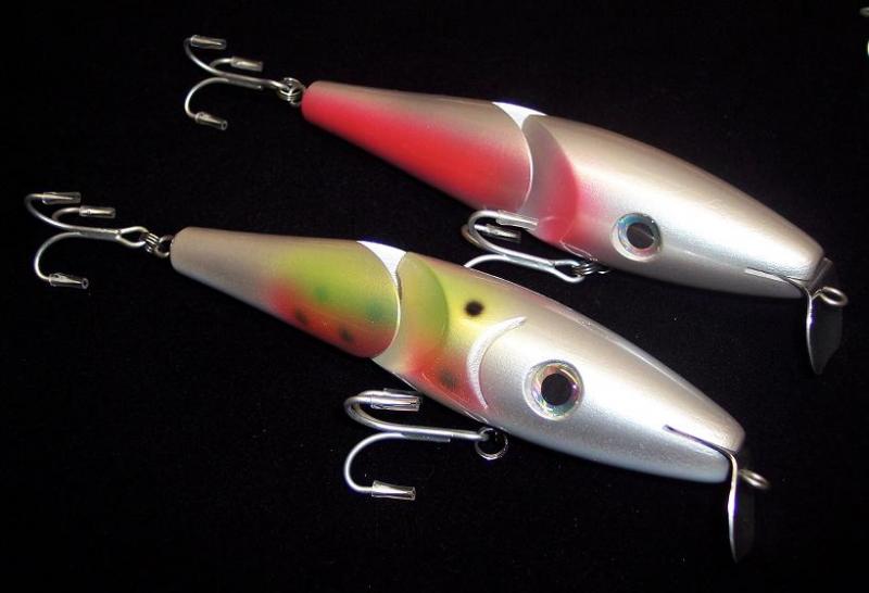 Also been working on a few new jointed versions of the "Prey" swimmer and my 3 oz. Danny! Have not had these in the water yet as they are prototypes but they will swim soon! I think the design will provide a tight wiggle with th water flowing into the joint! I like the result though! Fun to try to carry the paint over from front to back...gives a great result!