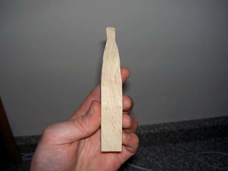 Do yourself a favor. Start with a hardwood dowel. Find the center and use a compass to draw concentric circles on each end. Use a rasp (or microplane tool even faster) to bring your diameters down to the line, draw another concentric circle and bring it down some more, until you have the shape you want. Then mark off your slope and chin shape (use a papertowel tube, cut it length wise and reduce the diameter to what you need, draw a profile and cut it out). Use a coping saw (they are cheap) to rough it out, then your rasp and sand paper to get it right.