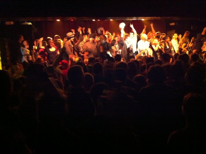 Toots & the Maytals last night at the Paradise . They have quite a following of young people. Place went nuts . Audience got up on stage with the band until Toots was sitting on the bass drum . You can only see one back up singer in my nephews cellphone pic left. The band never stopped playing during the invasion with Toots wailing away . He sang happy birthday to some girl in the audience just off the cuff with the band . At the end he gave all the bands bottled water out and shook hands with as mainy as he could .. It was kind of a reggae,, soul ,, religous event .. They ended with 54-46 (his old prison number ) covered by Sublime.. To top it all off I was carded at the door .. Thank you ,, doorman ..