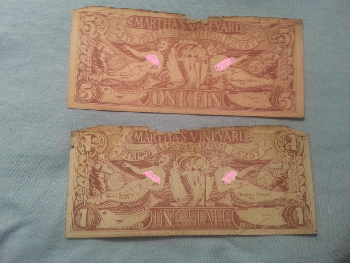 In September of 1986 my wife and I were driving from Oak Bluffs to Edgartown having just driven over the big bridge when she takes an envelope out of her pocketbook and asks me how many "fins" were in her hand. They were my winnings from the year before in the derby that I never bothered to count. I just looked and assumed about $200.00 worth. She started counting, and counting and counting. She stopped at $500.00. Everyone accepted the "fins" then. It sure made my "86" derby a lot nicer. I just scanned some of the last they issued of them on the computor a few days ago. The number on the bill is #25??. Originally called scales and then fins. I kept a bunch of them over the years for keepsake. You were awarded them for daily, weekly, and end of derby prizes. The other big prize I received at the "85" awards ceremony was a free weeks vacation at a cabin in West Tisbury. I only ever got one dirty look using them. It was when I paid the bill in the Navigator for dinner with them. Paid the tip in cash, and that still didn't bring a smile to the guys face, and it was a good tip.