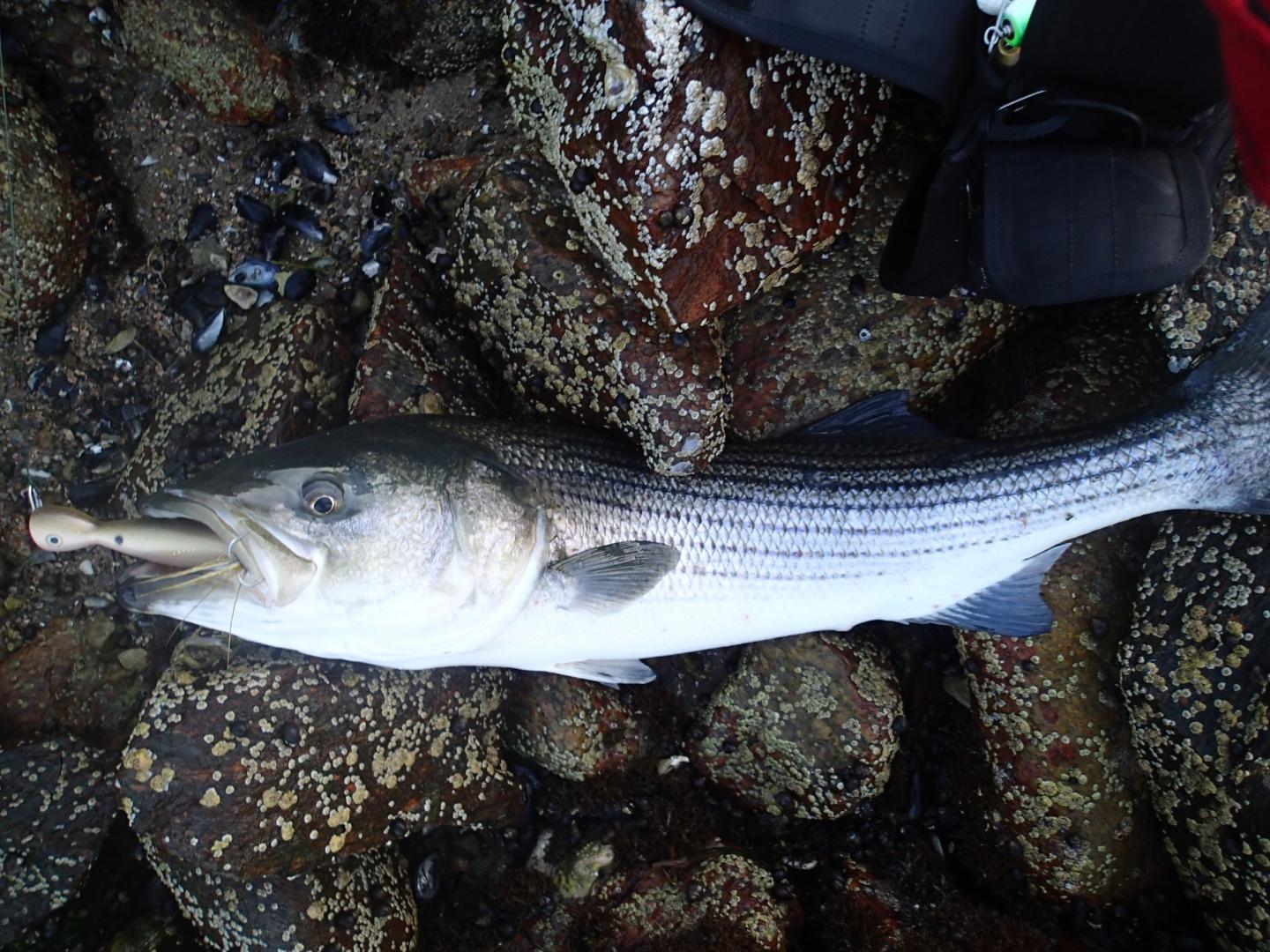 Couple nights later the first pic is a mid 30 lb fish caught on a really cool plug. It is an over a foot long needle made by a gentleman from Conn. that I got in a trade. Gigantic is the only way to explain it. Was really fun using that plug and the fact it floats allowed me to fish it real slow with a lot of pauses like few nights before. Fight was great but the fish put the siwash thru my finger landing it, lucky I crush the barbs. The next fish was the best of the few nights. I wandered away from the few guys I was fishing with that night and again the med white danny just twitched on the surface and reeled extremely slow was the ticket again. The fight was one of the best I have had in years with tons of drag being taken on several great runs but being only sand in front of me there was no anxiety of losing the fish on rocks or structure. Very enjoyable. All the above fish were revived and swam away. I do sell fish but it was quite rewarding letting these fish go.