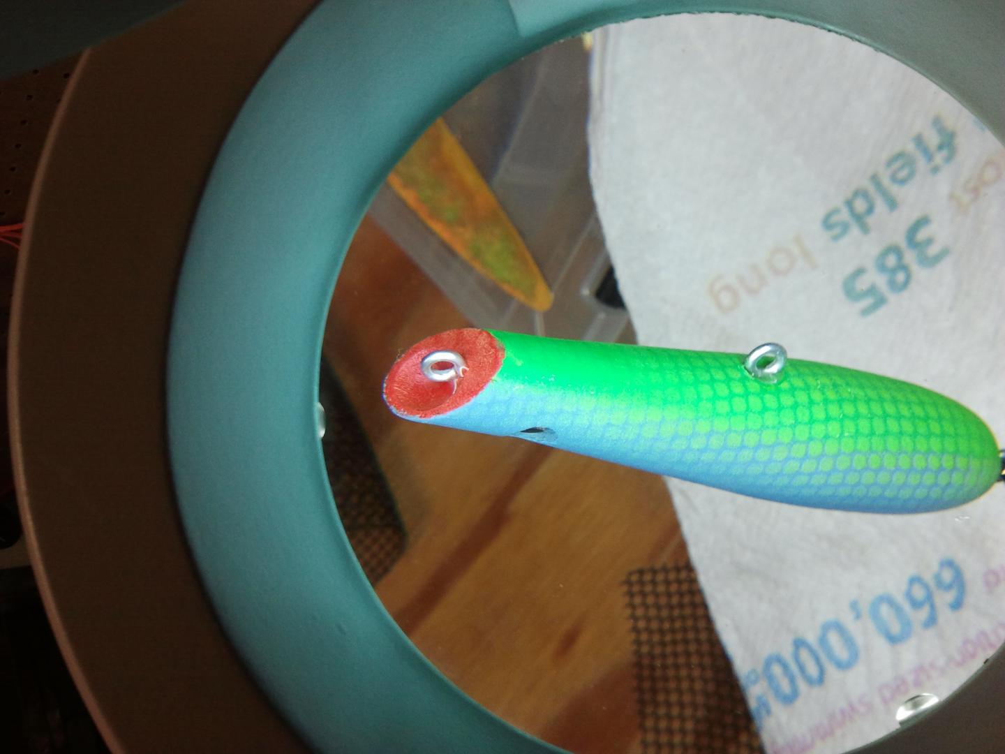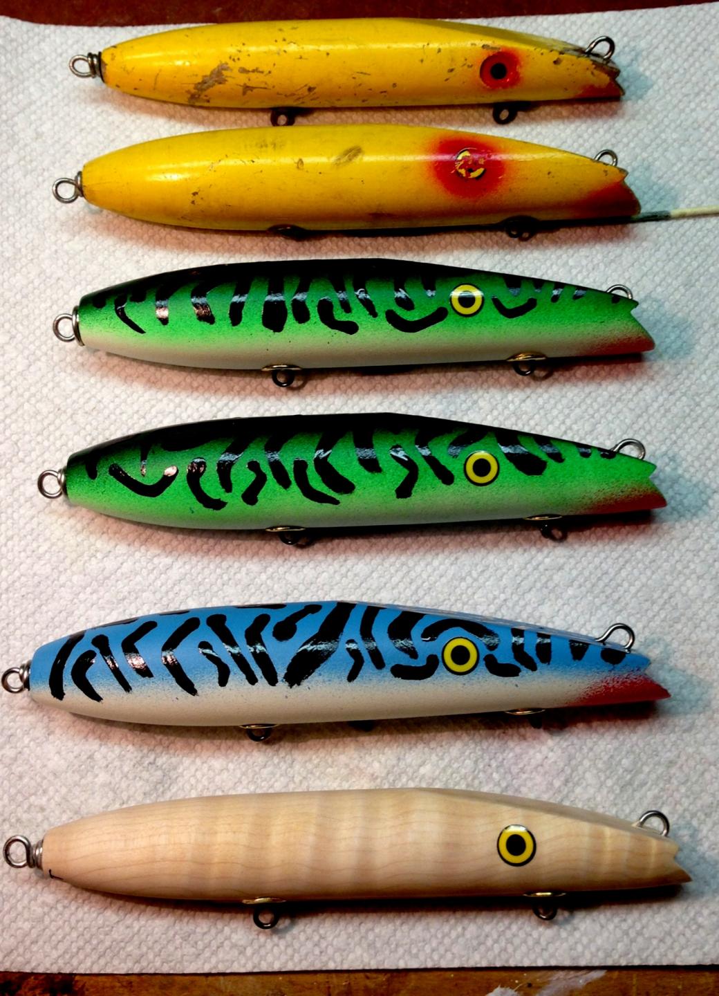 Still had no time to test my versions of the Musso lipless yet, Ted yours look great. I'm going to belly weight one of them as Musso did and also try a Nike style weighting also. Keep seeing stuff on the boards about BIG darters so I gave one a shot last night. Totally winged it on this one, used one of George's for reference. 9" and 1.75" dia. looks like right about 5 oz. finished.