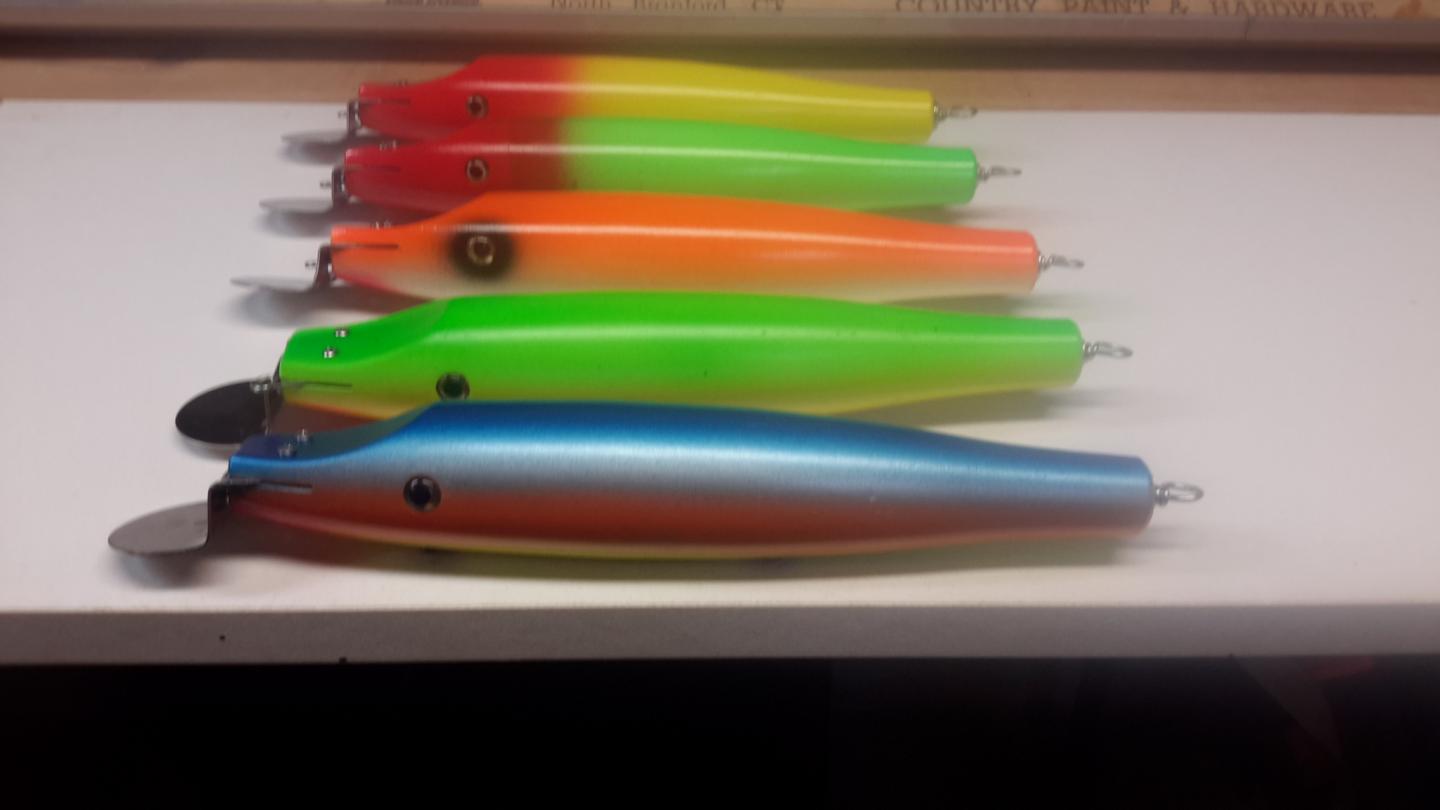 It's Sunday morning. I have my coffee and planning my stay in the "cave" today. Finally the minimal lures I did are primed and will put some colors to them.Made up some "bone" white to shoot for belly. I have a few color requests but the rest I don't know. Usually once I get the paint in front of me I brainstorm what to paint. My new scheme is lime green w/red head, Black over sprayed with red, purple and misted w/gold is my new dark color. I have pikes which will be painted in blackfish, porky and sea bass colors. Blackfish and sea bass was a producer last year. I paint the blackfish white then scale black then over spray brown in blotches vertically. Sea bass is light blue to silver belly over sprayed with black scale. I use a thicker net to show more blue. Trying to find some net similar to clementine netting but with smaller holes and wider net lines. Enjoy your day guys. I post some pix soon.