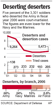 An Associated Press examination of Pentagon figures shows that 174 troops were court-martialed by the Army last year for desertion — a figure that amounts to just 5 percent of the 3,301 soldiers who deserted in fiscal year 2006. The figures are about 1 percent or less for the Navy and the Marines, according to data obtained by the AP under the Freedom of Information Act.