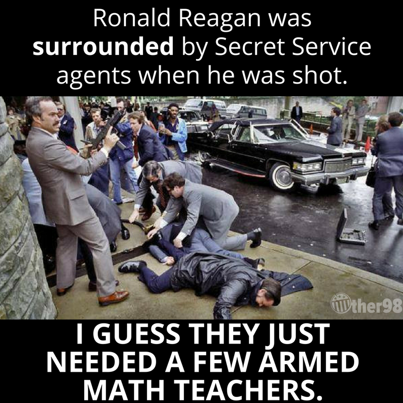 Read Trump's actual statement about teachers. He didn't say that all teachers should be given guns. He said look into the possibility of taking a small number of teachers, and training them to safely have guns at school. He didn't say to give a bazooka to everyone who works at the school, OK?