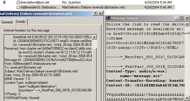 plus: i have been getting tons of e-mail failure notices as well as false emails from "myself" ,from john @s-b from mikecc and everyone else in my e-mail address book (now deleted)and even from people not in my email address book that was taken from my email cache file.... (now also deleted)