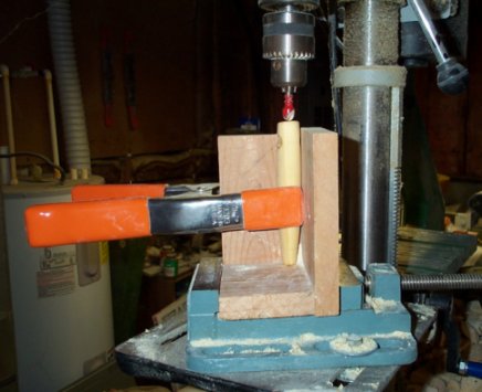 Jigman, sorry to criticize without offering an alternative. I have not done popper mouths that way so I will have to think about it. What about placing a vertical pin in a board the same diameter as the through hole. Place the plug on the pin, then keep the plug from spinning with a handscrew clamp. The pin could be a long machine screw. You could add some blocks to elevate the clamp closer to the action. Some handscrew clamps have groves for grabbing round stuff. Some of the other posts look promising as well