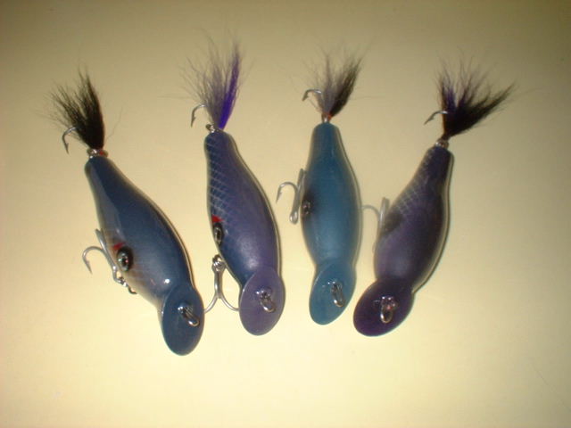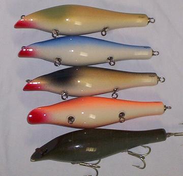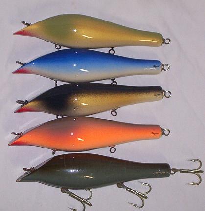 I tanked the original in a bucket of clean fresh water and it sits perfectly level the top mound is above the surface so it will probably sit level only a tad higher in salt .. I'm not putting this in the salt .. These are my first,, shape is almost dead a little tweaking left ,,but .5 ounce of lead in the arse is too much !!!! 1st batch sit like poppers... I put 3/0 trebs matching orig.. I can bring the nose almost level swapping a 4/0 on the front and removing arse hook but it still isn't good .. I'm afraid I'm going to have to cut wires and drill some lead out of the arse.. We'll figure it out.. I'm using pine.. a special pine that grows in swamps .. the grain is so tight .. I'm still under 3 ounces though.. When I was painting I was thinking House paint.. still a little flashy though..