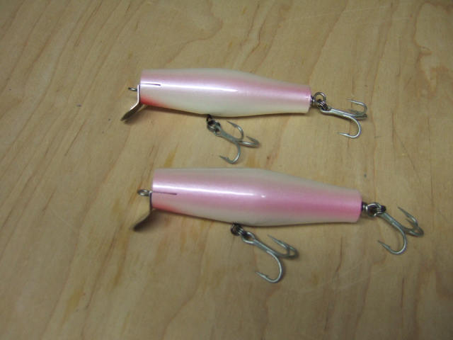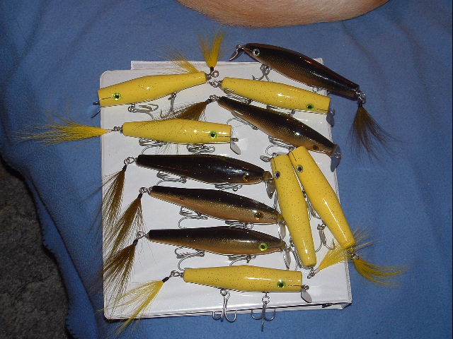 These are the plugs I had epoxy trouble with. They are a handcarved swimmers with glow in the dark eyes. You can't see the purple glittter on the bottom of the plugs. At least I know these will be used. Most of my pluggage ends up never seeing water. These are rookie design for me.