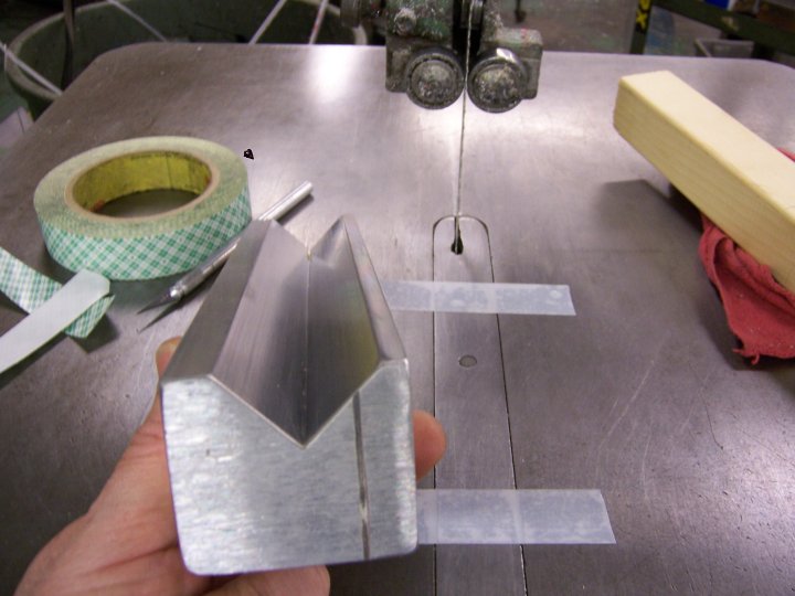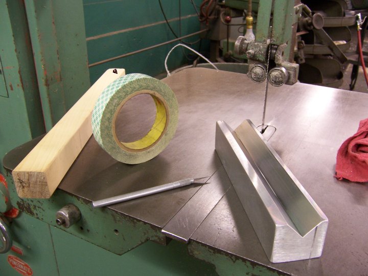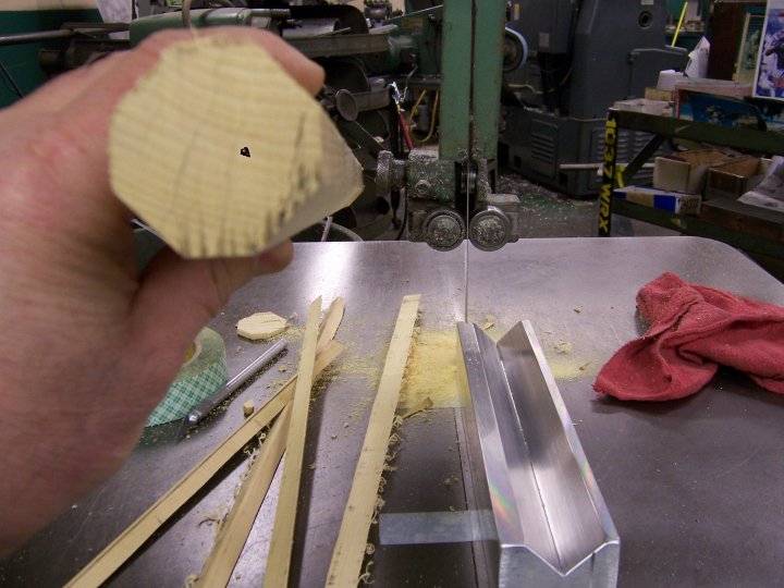With several people using the home made type duplicator now I have a simple jig that will take the nerve wracking aspect out of the turning process which is turning square stock with a hand pressure tool. The edges. I know that it looks like a small amount of material being removed but it makes a big difference with this type of duplicator. It will save you time because you don't have to go so slow in the beginning to get the stock round. I do all my stock this way at once when I buy it. So when ever I need stock I just grab it and it is pretty much round already, octagon actually but much easier to use. 2 fast passes and I am round. No slow going to get to that stage. I do any length from 8' to small individual pieces. Now I know I am using an industrial grade band saw with a big table but you can bolt on a larger work surface easy enough. You might not have to. I made my jig out of aluminum but you can do the same with wood. Tilt a table saw at 45 and you have a V block. Make it long so the stock will be supported well. I have tried just using a table saw to cut off the edges of the stock. It will work but I found it to make a hell of a mess and dust bowl in my cellar not to mention kind of dangerous to the fingers.
