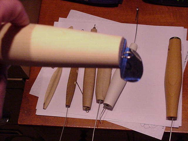The blue thing are off center turned swimmers. found them in the reject box and finished them. The little squids are very slow sink level needles. One of my staple plugs, a skin will fit over them, too. Clinton cobwebs, they realy light up in the flash, don't they?  On the little blue things that look like Minne Balls are skin jigs, maple filled with lead. They'll also carry a curly tail.