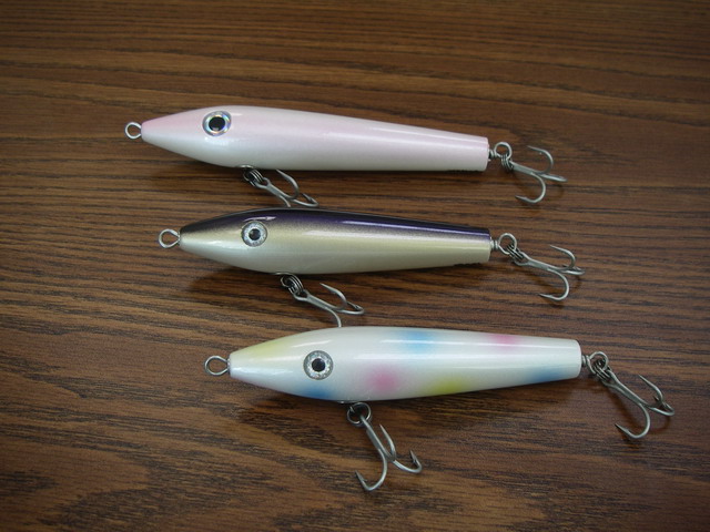 This plug is one I've been working on since Fall. I wanted a plug I could walk aggressively then stop, give a little pop then let sit. Walk, pop, sit. Etc. So this is what I came up with. It was a real pain to get weighted properly. To much tail weight, wouldn't pop right, too little and it wanted to glide. Front hook placement also helps keep the nose down. Length is important too, for the walk the dog action. Amazing what 1/2" will do. I started with my favorite plug as a platform (Bernzy surf howdy), then added some spook and popper characteristics.