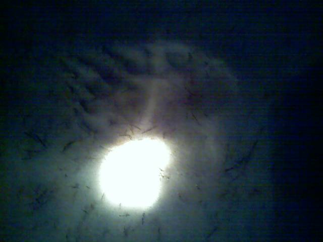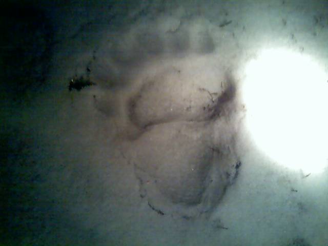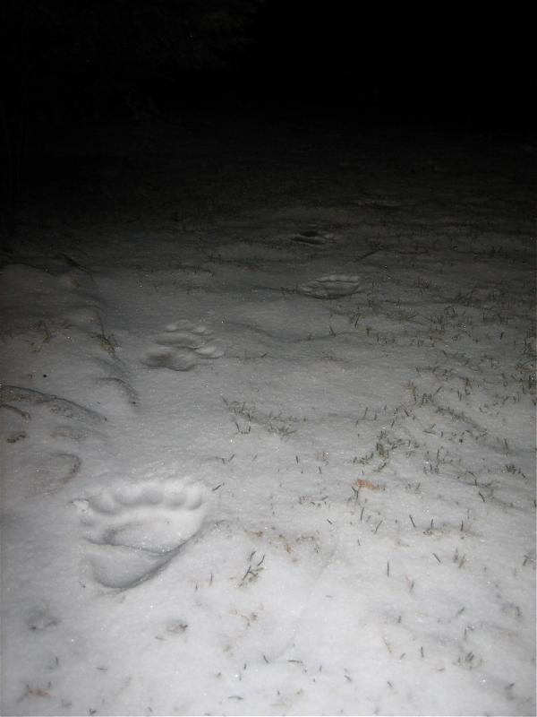 There is two sets of prints. One went one way around the house and the other the other way. One sat under the birdfeeder and ate the seed. Crazy thing is the larger one put one paw on the front step. One of our cats just sat on the porch and watched. I have a cell phone pic I will try and send.