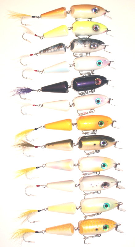 Right now I'd say I have about three dozen Smiths that will probably never see the water. Sorry, but I've removed those from the collective pool of the hundreds of lures that Ryan releases every month. Those are mostly unusual scale patterns, mackerals, trout, weakfish, etc. Even my wife, who facetiously complains that I'm "married to fishing and not her," enjoys Ryan's work so much that she wants me to put a display box on the living room wall. If she'll let me hang lures on an upstairs wall I'll do that. The remainder of those that I have in the cave are at risk -- even at risk of bluefish attack.