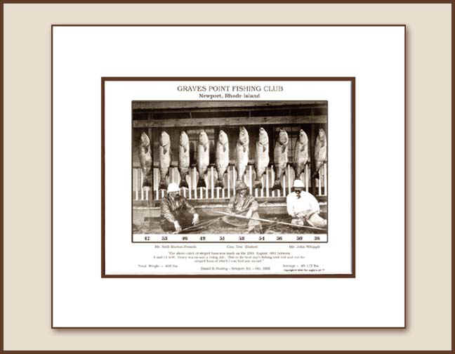 First is the historic Graves Point Fishing Club print from Newport in 1881. The bass club was built by JP Morgan and stood just to the east of Brenton's Point until the '38 Hurricane took it out. The catch was 10 fish, total of 495 lbs taken in a single incoming tide from 6 to 11 AM, August 29th, 1881.