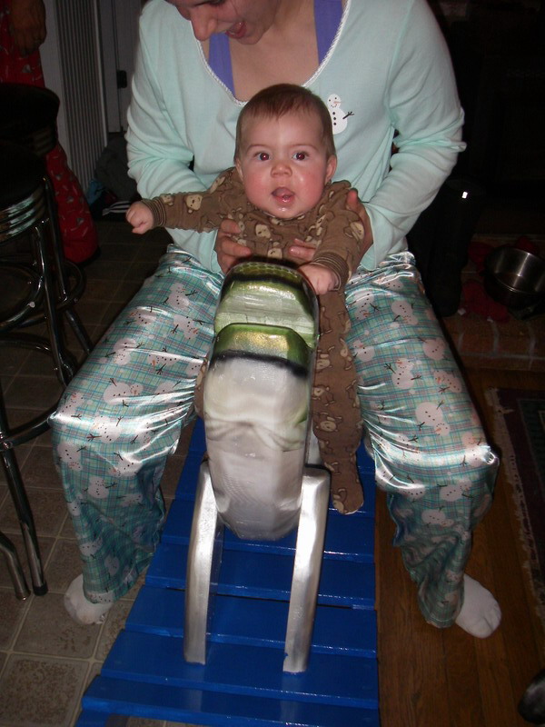 When my two daughters were younger I made one a rocking horse and the other a rocking cow. This year my oldest wanted a special rocking animal for my new Grandson. So I chose to do a rocking fish with a wood plug in its mouth of course, named "Sammy the Striper". Trouble was there was no design to be had anywhere so I came up with my own. Finished product is 47" long and 35" high and can hold my daughter and her son. The tail is held on with screw eyes with bushings between them so that it moves while he rocks.