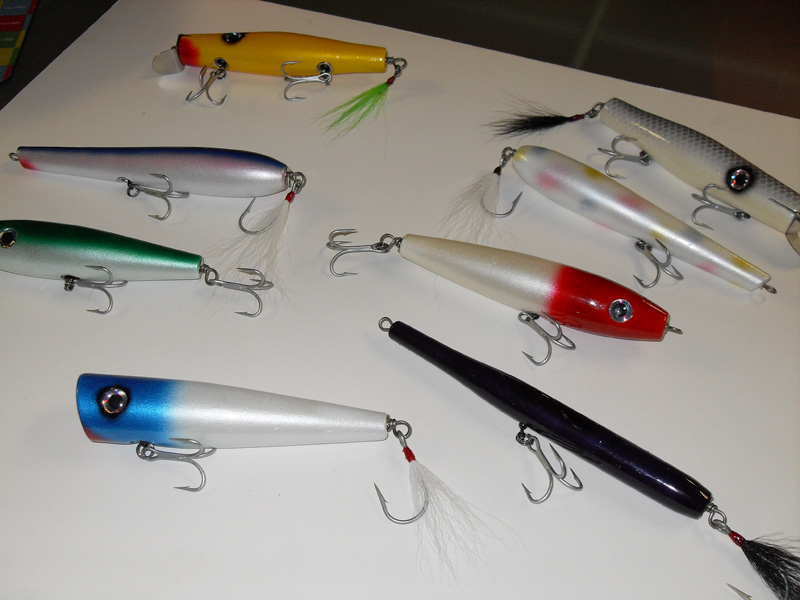 The pencils need to be tail weighted more, I would like them to sit more at a angle when there's no retrieve. Belly hook on the popper is too far forward, I messed up my first couple of popper mouths and i cut this back more. Danny's are MikeCC kits (should have left them blind  )