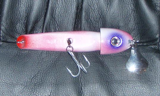 I've seen 2 variations of this plug , built by a well known local canal fisher . Not of internet fame but quietly fashioned jiggs , wood and rubber to catch fish in the ditch . The inspiration for building this plug was Big Daves fishing partner and friend, the late Paul Karnicki . Paul laughfingly called this a pecker plug . You can't see it but the head is back beveled to pull water . I've also seen real old freshy versions of a pecker plug .. Do you know who made it orig .