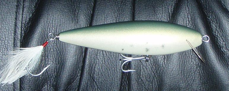 These are for Backbeach Jake. He challanged me to make one of my small spooks in any color I wanted. Did up a classic jiggy blue. Figured that wasn't much of a challange, so I did up a larger version, in a sort of olive mac color. Figured he is getting on in years, so I personalized it for him as a helpful reminder who he is