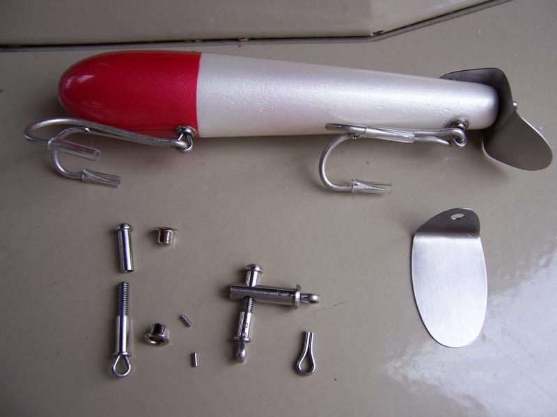 Ok my friend here you go. I wanted to use cotter pins like the original so to create the illusion I used cut cotter pins. I then pinned them into a bore which I threaded thus the bottom of the hanger. I then tapped the top part and rounded the head creating the illusion of the welded, solder, top part. The front grommet was done the same way with a hole drilled thru it to take the front hanger. It was a lot of fun to make and even more fun to give to Eddy. I have to thank VB, as it was his collection that inspired me to make the plug. I fell in luv with it as soon as I saw it. I thought insect at first and then black widow, thus the red hourglass. Thanks again for the accolades I am truly flattered.