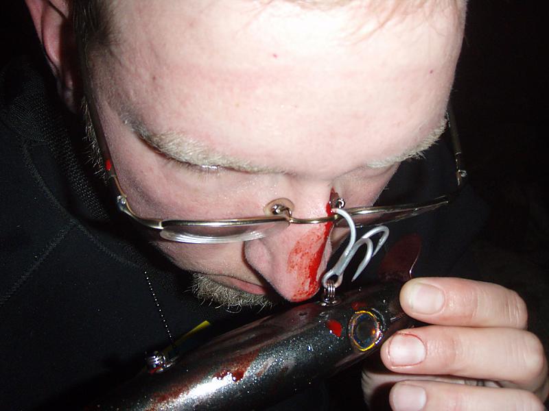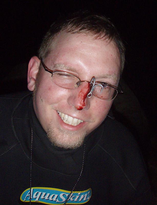 yeah, i'm really fortunate that the one hook dug in after bouncing off of the frame of my glasses..... I felt the other set of trebles bounce off of my right lense.... I was with my buddy Orlando and we had to take a 2 mile walk off of the beach. He removed the plug from the wolverine triple splits on the spot and we laughed, I said ouch and then got to the Westerly ER. The nurses and dr. couldn't believe how close it had come to my eye. It was a freakish accident. I was reeling in and hit something. Gave it a simple pop, as we all do, and a wave caught the plug and rocketed at my face...