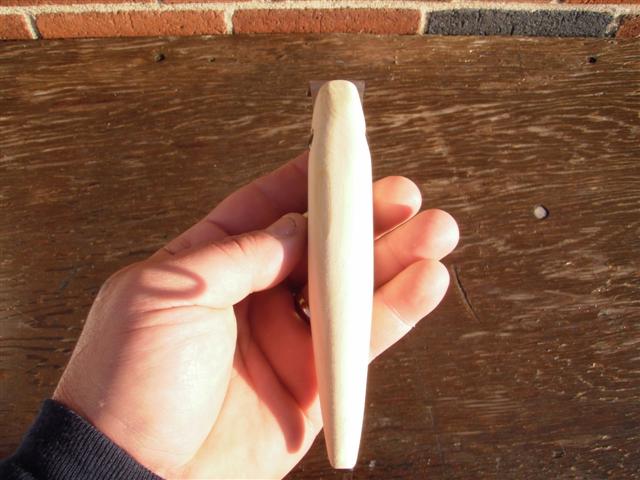 The turned model shows if you look hard, the dowel plug in the tail. The blank shows the dimentions. 3"from hook hole center to nose, showing the 3" area for the weight and the length from tail to end of weight hole 5". Plug 8.25" total length.