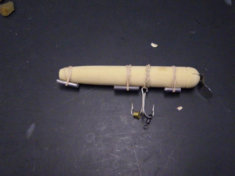 I turn a more cylindrical plug than usual (ie less tail shape). Pick a bigger lip (this is a pikie 3 but I've always been impresssed at how well the atom shaped lips swim a skin). Put a BIG hook where I want it, then float it and fool with movable weighting to get it to float where I want. This one is meant for the canal and to get beneath the surface so it will use extra lead to float low (sans skin). On the finished plug, only the tail weight would be through wired. The other weights I just use belly weights of the same gram weight. More often I would use a single belly weight behind the hook and a small tail weight to counteract the thick tail's buoyancy and help cast better.
