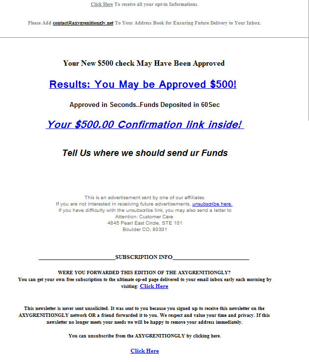 How many people do you think fall for their tricks? Click here (the attached has 3 different versions to get a response), unsubscribe here, send us your bank account info to deposit the winnings, and if all that doesn't work send us a snail mail letter to the address below..