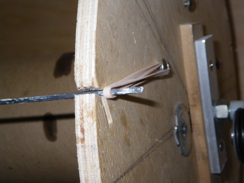 I use piano wire bent on one end that slides into a slot (with an index hole on one end) and held in with rubber bands.