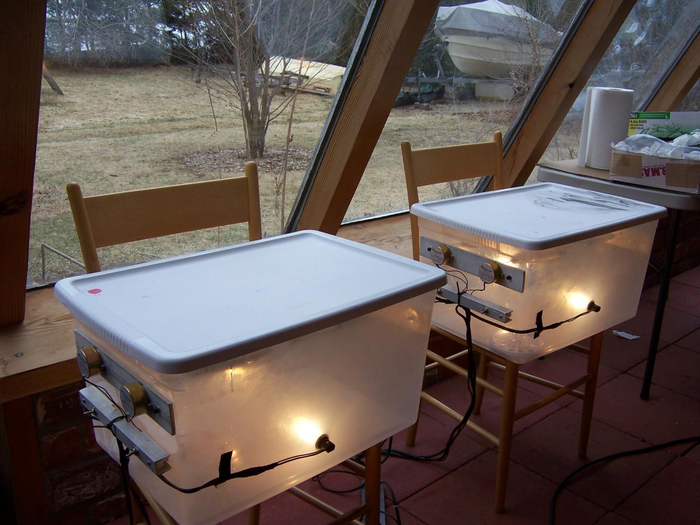 I see Bruce posted the picture of the twin towers....the bottom one was the first one I ever made, it was made from scraps... I only purchased the light bulbs... The motor was from an old oil skimmer, the gears and pulleys came from an old copy machine...3/8 threaded rod was used for the adjustment and threaded through F&M plates scrounged from work.. I used swivels from my tuna hand lines... the new one, is powered by a rotissery motor, all the belts and pulley bought from McMaster carr.. I did spend a bit of money on that one...George is right about the gear motor, pricey, but you will only buy it once...if and when either motor goes,I'll replace them with a gear motor...BTW... the first one still is going strong... i keep waiting for the copy machine belts to break, but it has not happend yet...