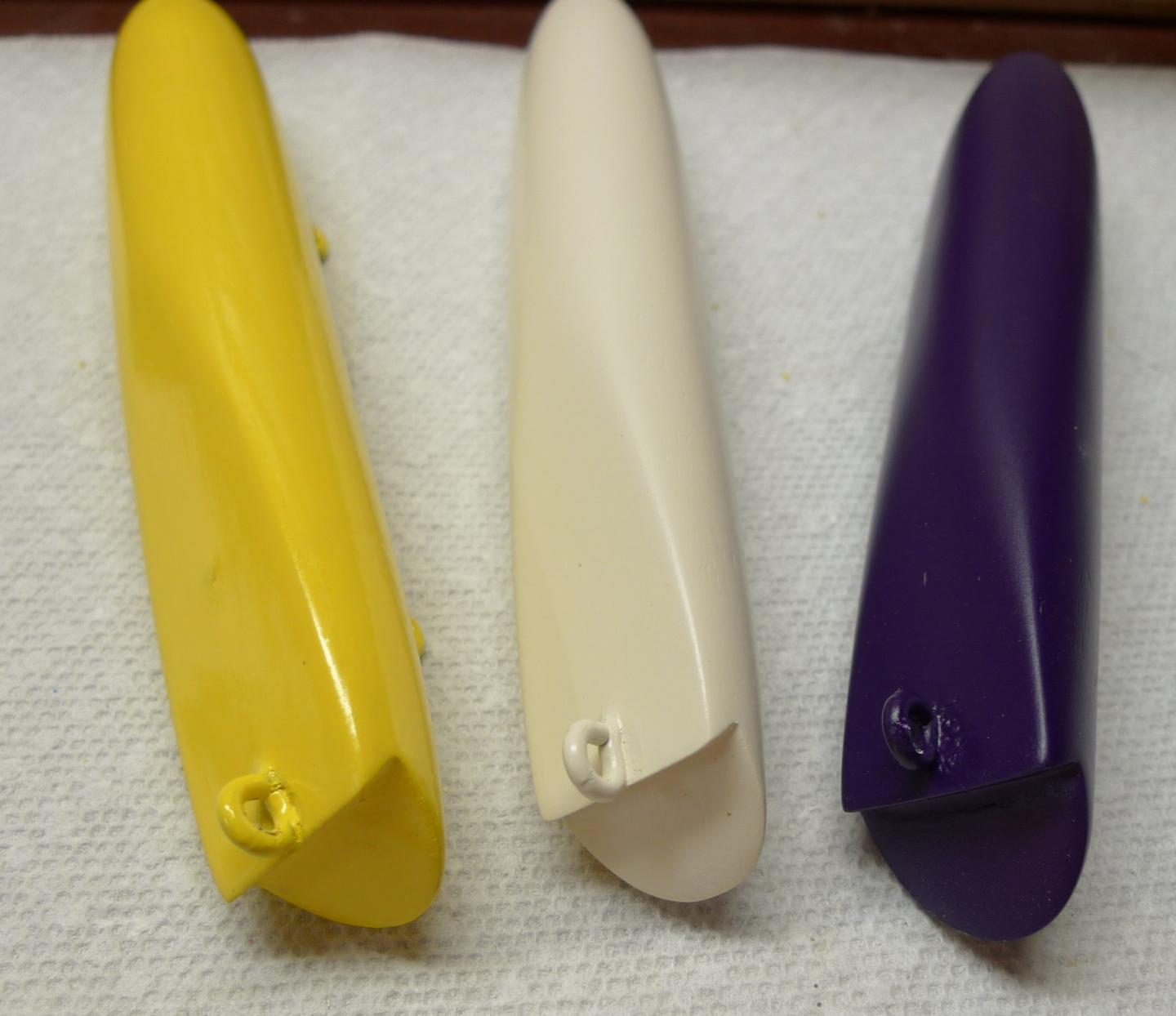 Made 3 of the Screw eye 6 and 5/8 inch darters according to one of the articles Frech published in the Fisherman ... decided to stick to SS screweyes instead of thru wiring... made them in yellow birch... I decided to move the stern belly hook back just aft of the wt position so 4/0s will not marry while casting