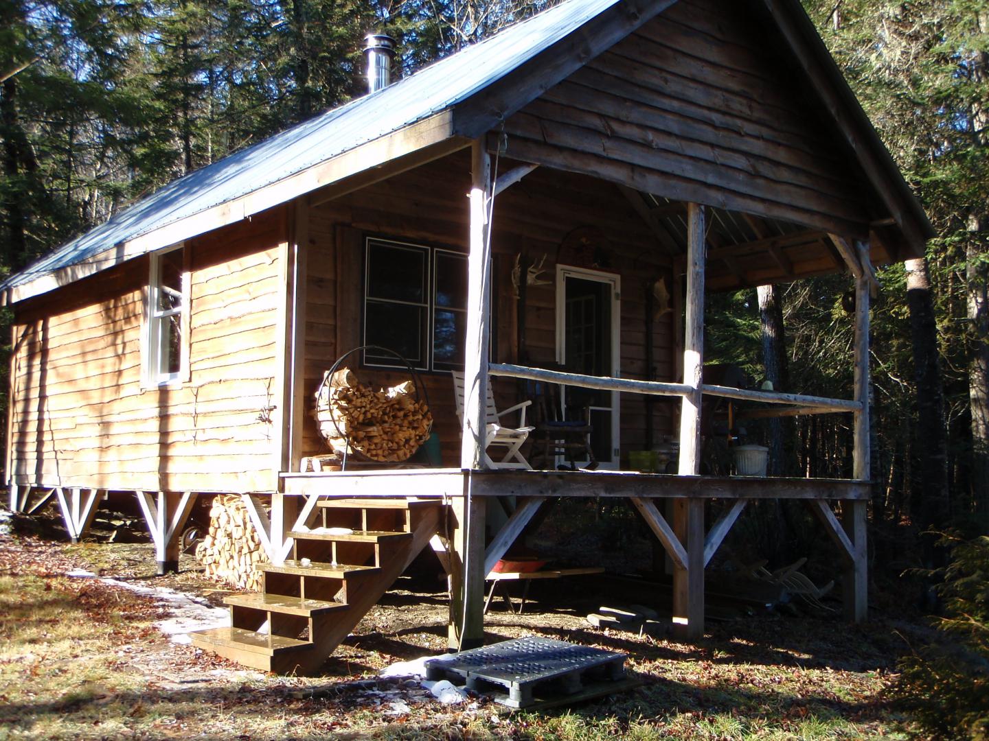 The green bucket on the porch is the home made Army style shower that hangs on the rope over the plastic skid... Privacy courtesy of The North Maine Woods