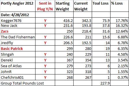 235 pounds total weight loss for the group. Let's try and hit 250 by the end of April. If we all lose 2 pounds this week we can do it. As Kevin Millar said "It's time to cowboy up".