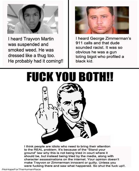 I don't think Martin was shot because he was smuggling Skittles or profiled for wearing a hoodie, he was shot because he somehow ended up on top of Zimmerman beating his head into the ground(I'm just going by the evidence), how he ended up there is a matter for the jury to decide but I don't think I'd be justified if I was being followed by a homeless person asking for change and ended up on top of them beating their head into the sidewalk because they were bothering me or profiling me as someone who might give them some money  ..they have a right to be on the sidewalk just as I'd have a right to walk past them, if they ask me a question or even harass me verbally, I don't have a right to beat them...