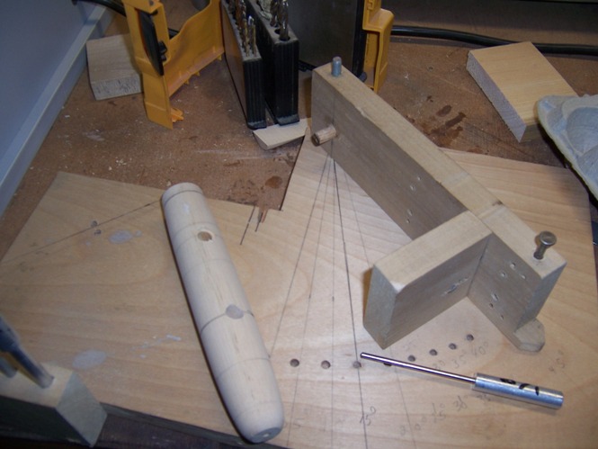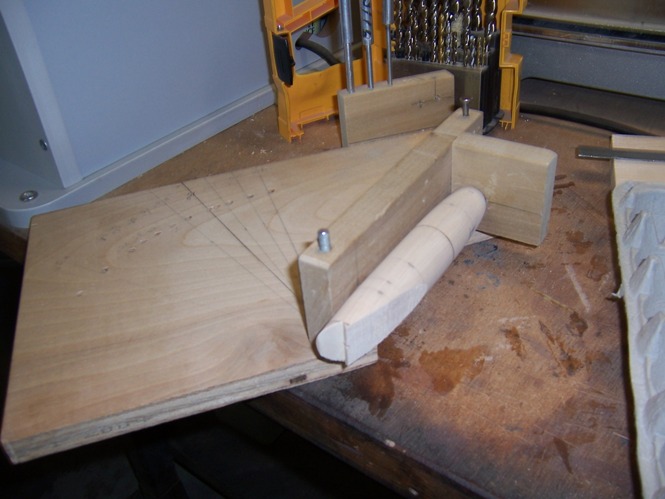 first picture is of the jig... the dowel on the belly holes fits snug.. 0 play... the tail stock pin holds it secure....