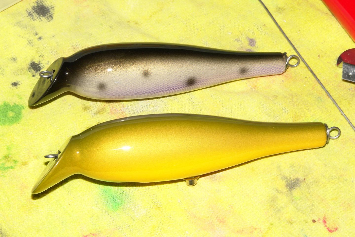 Working on some lipless styles, also did this bottle a few weeks ago. It's based on my little neck popper. My regular bottles have a good tight wiggle and I had good luck with them but am looking for a little wider sweep and wiggle so I gave this one a try. Little chunkier toward the rear and thinner neck. Swam it in some current yesterday and got just what I wanted. Thought it might roll over but she swam great! Now to try a version of the Musso Lipless with the same basic body design of this bottle, the challenge will be getting it to swim with tail weight. Pic's below of the new bottle compared to my originals.